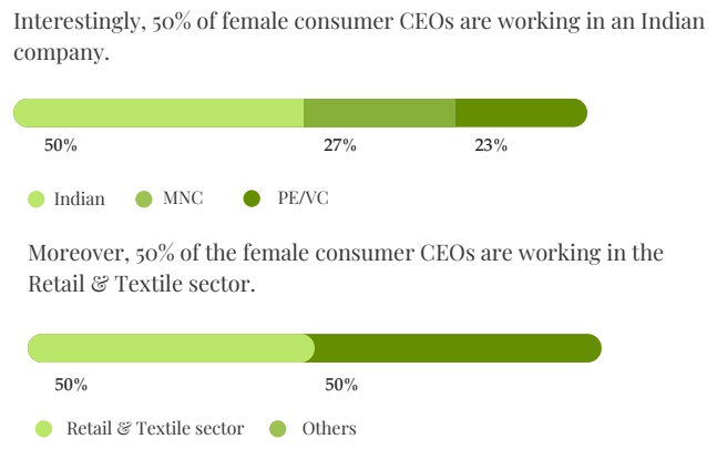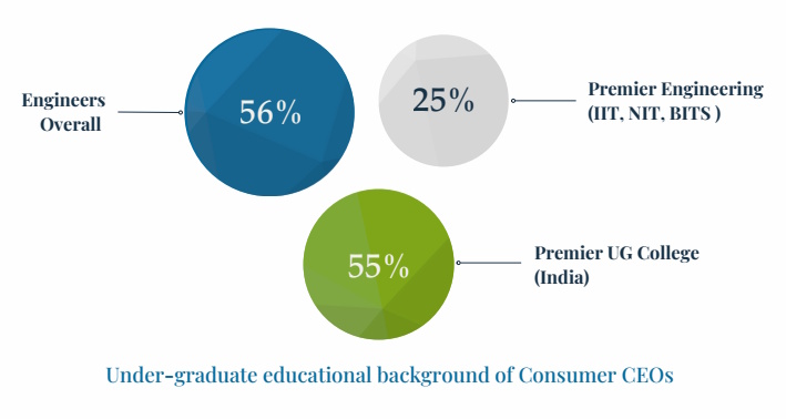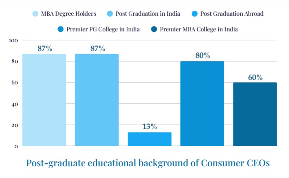 - MBA is the universal PG credential for a Consumer CEO – 87 percent possess an MBA; 3 out of 5 CEOs have passed out from a premier B School in India.